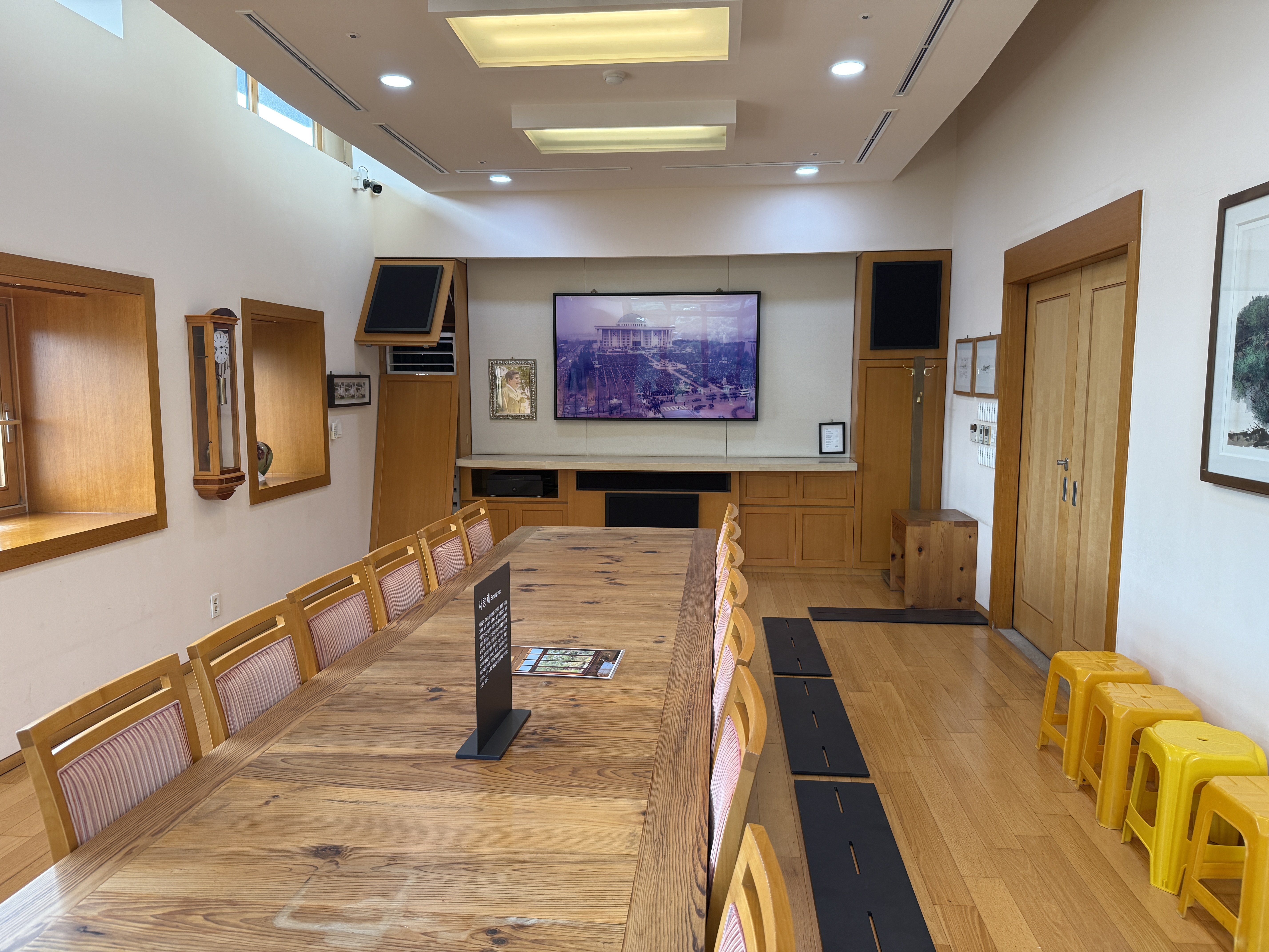 사저 입구에 들어서자마자 가장 먼저 눈에 들어온 것은 '사람 사는 세상'이라는 문구였습니다. 참 정겹고도 의미심장한 글귀죠. 방문객들을 안내해 주시는 분의 설명을 들으며 다양한 공간을 둘러보게 되었습니다. 넓은 테이블과 의자들이 놓인 회의실 같은 공간에도 이 글귀가 보이는 듯했습니다.