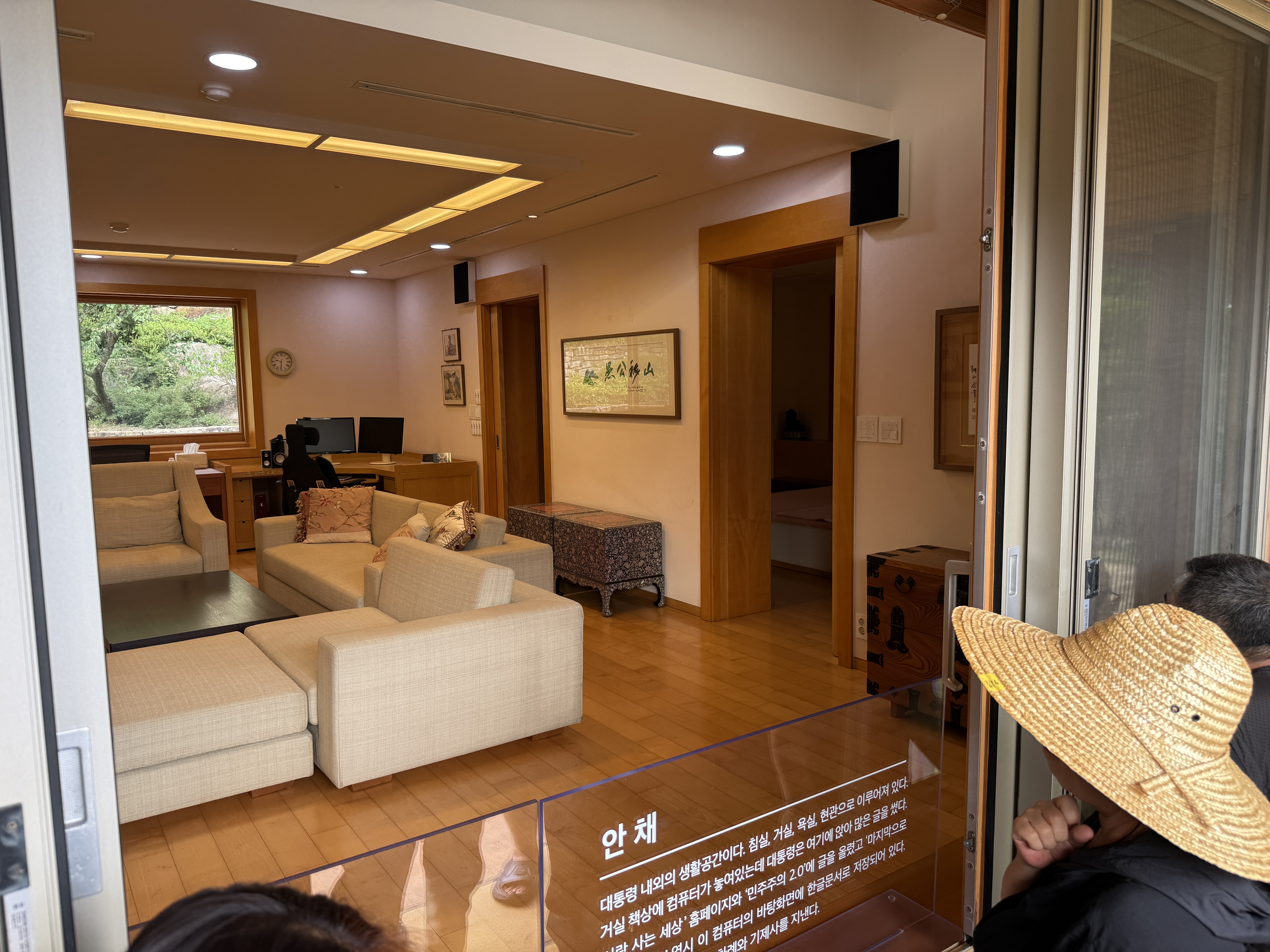 사저는 화려함과는 거리가 멀었습니다. 대신 소박하면서도 따뜻한 분위기가 느껴지는 공간들이 인상 깊었습니다. 특히 많은 책들로 가득 찬 서재에 시선이 오래 머물렀습니다. 노무현 전 대통령께서 이곳에서 얼마나 많은 고민과 공부를 하셨을지 짐작하게 했습니다. 편안한 소파가 놓인 거실의 모습은 소탈한 일상을 엿보는 듯했습니다. 통유리 너머로 보이는 바깥 풍경은 시선을 사로잡았습니다.