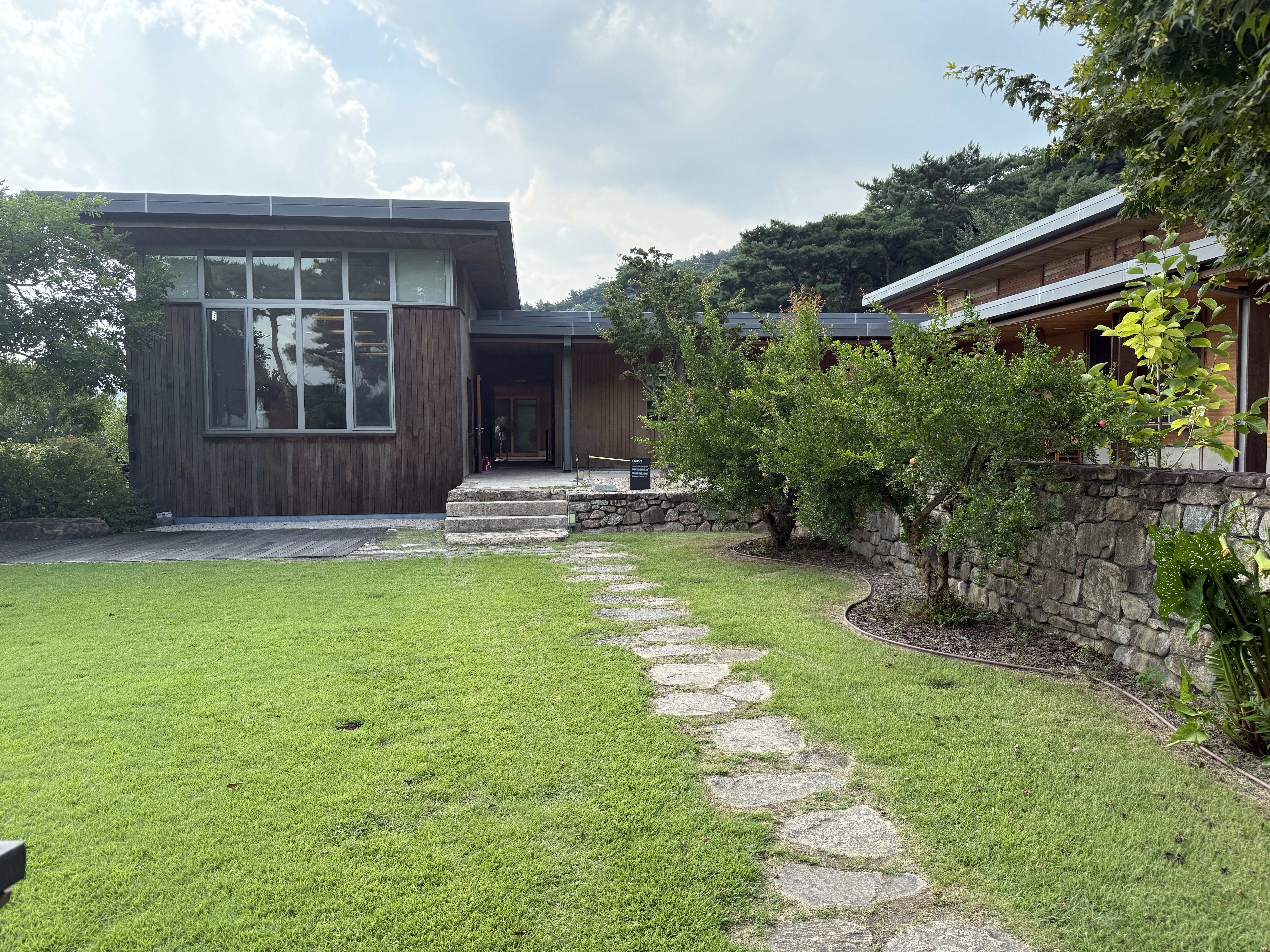 사저는 봉하마을의 아름다운 자연 속에 마치 한 부분처럼 자리 잡고 있었습니다. 주변 환경과 조화롭게 어우러진 건축 디자인에 감탄했습니다. 특히 건물 중앙에 자리한 작은 마당의 조경은 고요하면서도 깊은 울림을 주었습니다. 계단을 따라 올라가면서 분위기가 인상적이었고, 푸른 잔디밭과 디딤돌이 놓인 길도 아름다웠습니다.